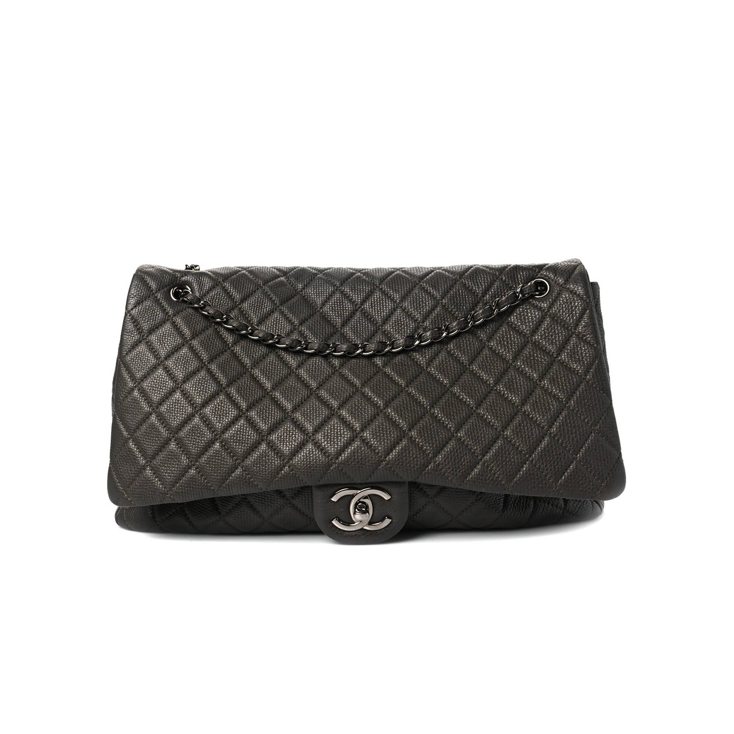 Ch*el calfskin quilted xxl travel flap bag khaki silver hardware (46*28*14cm)